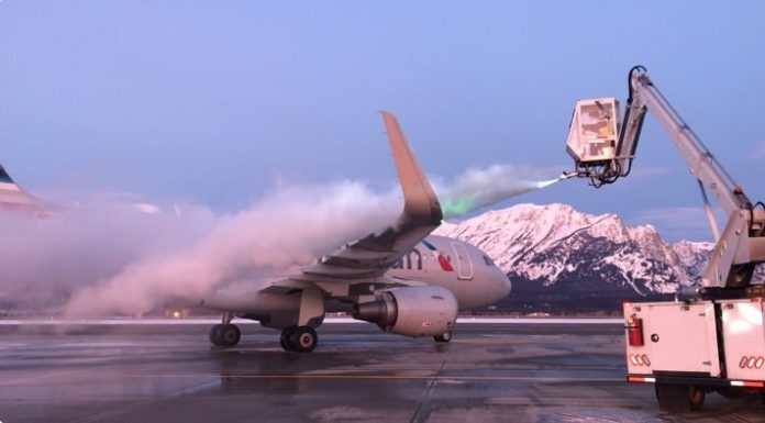 Um Airbus A319 é descongelado no Aeroporto Jackson Hole (JAC), em Wyoming.