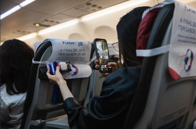 Passageiros do voo LA3018 receberam unidades do Bis Xtra e puderam assistir à partida ao vivo a bordo. Crédito: Divulgação LATAM