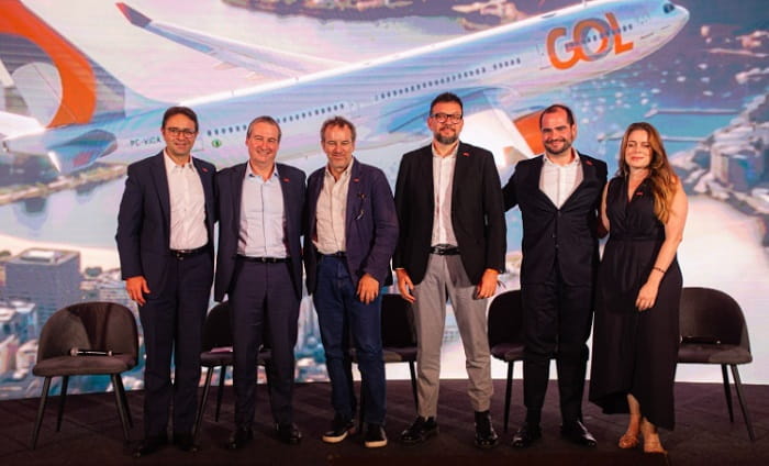 No palco, da esq. para a dir.: Celso Ferrer, CEO da GOL; Angus Clarke, Chief Commercial Officer do grupo ABRA; Manuel Irarrazaval, Chief Financial Officer do grupo ABRA; Albert Perez, vice-presidente de Operações da GOL; Mateus Pongeluppi, vice-presidente Comercial da GOL; e Carla Fonseca, CEO da Smiles (Foto: Victor Erlacher Espindula/ Divulgação GOL)