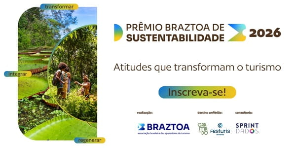 A Braztoa (Associação Brasileira das Operadoras de Turismo) abre, nesta segunda-feira, 27 de abril, as inscrições para o Prêmio Braztoa de Sustentabilidade 2026, principal reconhecimento do turismo sustentável no Brasil. Criado com o propósito de identificar, valorizar e dar visibilidade a iniciativas que integram inovação, responsabilidade e impacto positivo, o prêmio se consolidou como referência no setor, impulsionando a evolução do turismo em suas dimensões ambiental, social, cultural e econômica.